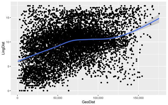 Having determined the geographic and linguistic distances between all pairs of localities, we plotted their relation, shown in Figure 9. The figure is a scattergram of the linguistic distance over the geographic distance, with a Loess smooth line added to visualise the pattern of covariation.