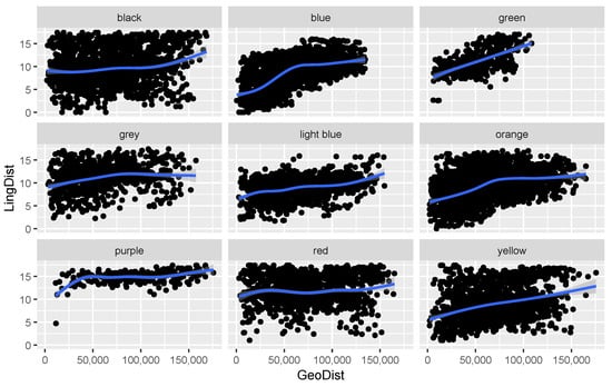 Next, we investigated whether this relationship between the linguistic and geographic distances was the same across the nine clusters. To do so, we assigned each locality to a specific cluster based on its highest admixture coefficient. Figure 10 shows a scattergram with a Loess-smoothed line for each of the nine clusters.