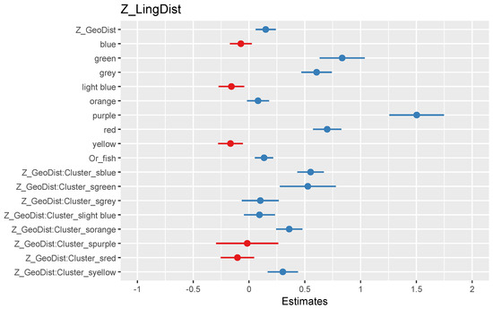 Figure 11 gives a positive main effect for Z_GeoDist, that is, the normalised value of the geographic distance. There was also a positive main effect of the fishing locality status. There were many effects of the clusters and their interaction with the geographic distance. The reference point for their values was the black cluster. These effects are visualised in Figure 12 and Figure 13, along with results from plot_model.