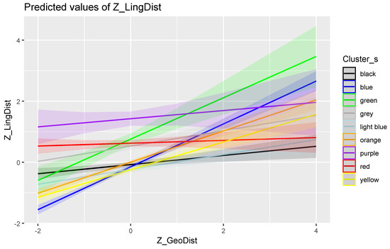 Interaction plot of the linguistic distance and geographic distance for the nine clusters.