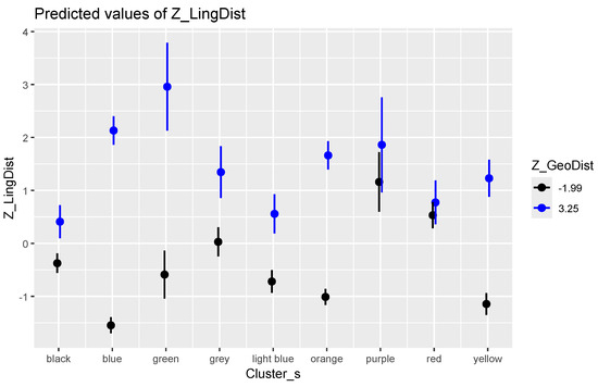 Figure 13 confirms the height of the interaction lines’ slopes. The x axis was switched and now represents the nine clusters. The distance between the blue and black spots represents the size of the slope. Moreover, the confidence intervals turned out to be larger for larger distances (the blue spots). There was more variation in the linguistic distance when the geographic distances were larger.