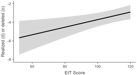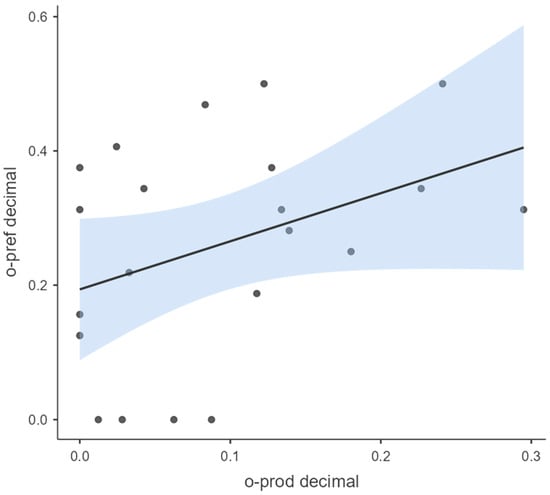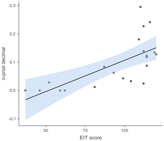 Although greater rates of selection of deletion in the preference task tended to occur with higher EIT scores (i.e., a positive relationship), there was no significant correlation between EIT score and selection of deletion, r(19) = 0.32 [95% CI: −0.12, 0.66], p = 0.153. In Figure 6, we can observe generally higher selection of deletion for the higher EIT scores; however, note that some learners with high scores selected little deletion and some learners with lower scores yielded rather high rates of deletion, contributing to the overall lack of correlation.