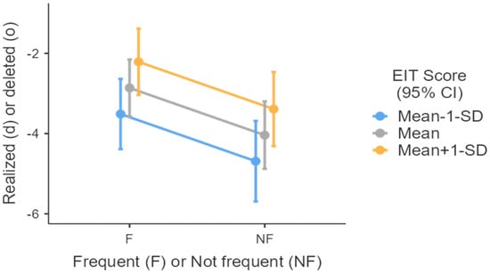 Lexical frequency was also a significant predictor of /d/ deletion; learners were significantly less likely to delete /d/ when words were infrequent as compared to frequent (Table 5). Figure 2 illustrates this pattern, while showing additional detail according to EIT score. Namely, although learners overall deleted /d/ significantly more with frequent lexical items, we can see that this was especially driven by learners with higher EIT scores. When learners’ EIT scores were more than one standard deviation above the mean, we note that they showed the highest likelihood of deleting /d/ with frequent lexical items, followed by learners whose EIT scores were within one standard deviation of the EIT mean, and lastly by learners whose EIT scores were more than one standard deviation below the mean.