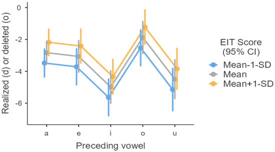 With respect to the preceding vowel (Table 5), compared to the reference level of a preceding /a/, learners deleted /d/ significantly less when the preceding vowel was /i/ or /u/. Comparisons with /e/ and /o/ were not significant. A closer look using EIT score (Figure 3) revealed that the higher rates of deletion for preceding /o/ and low rates for /u/ and /i/ were again driven by learners with EIT scores more than one SD above the mean and those within one SD of the mean, although once again, differentiation was greater for the former group, who showed especially high deletion with preceding /o/.