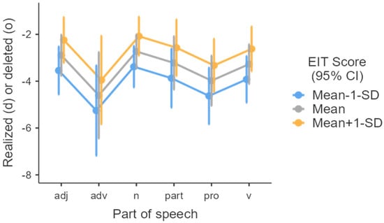 For the final predictor, the grammatical category of the word that contained /d/, learners deleted /d/ significantly less when the word was a pronoun, compared to when it was an adjective (Table 5). They also deleted less when the word was an adverb (although this comparison was not statistically significant: p = 0.073). Figure 4 illustrates that deletion occurred at the highest rates with adjectives and nouns and at the lowest rates with adverbs, pronouns, and verbs, and that learners with EIT scores more than one standard deviation above the mean again showed greater differentiation across categories, especially driving the overall higher rates of deletion in adjectives and nouns.