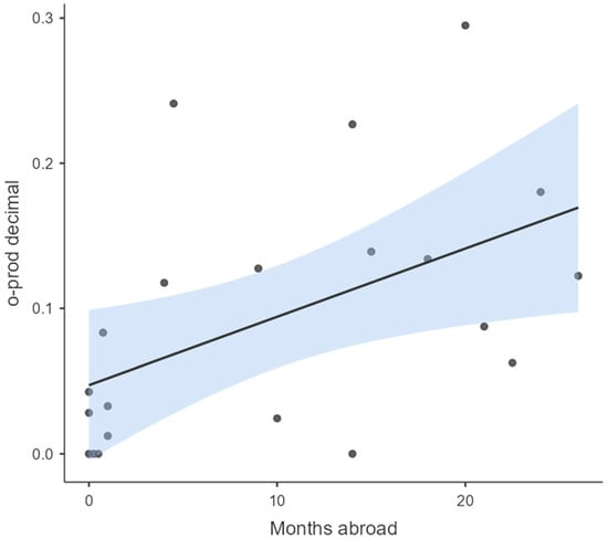 With respect to experience abroad, there was a significant, positive correlation between production of deleted /d/ and months spent abroad, r(19) = 0.51 [95% CI: 0.09, 0.77], p = 0.020. This is supported, for instance, by the learners with little to no abroad experience who did not produce deletion or who did so at very low rates (see Table 6 and lower left corner of Figure 8). In fact, learners with less experience abroad tended to be those with the lower EIT scores and with very low rates of deleted /d/: Jen, Anna, Emma, Kara, and Jeff (though Jeff’s EIT score was rather higher than the others). Of course, despite the correlation between time abroad and production of deleted /d/, some of the learners with the longer stays abroad (Ty (22.5 months) and Kenzie (21 months)) showed low rates of production of deleted /d/.2