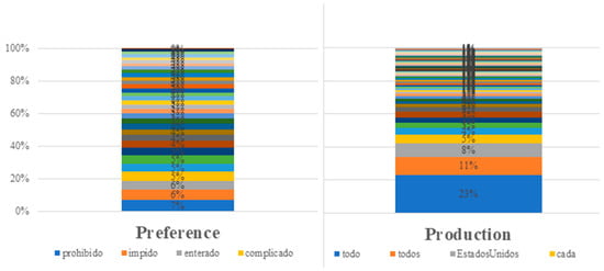 Still, we argue that these differences between tasks are important and may, in fact, help clue us into mechanisms for learning as long as we recognize, acknowledge, and account for how such differences affect the data collected. For example, if we return to the different findings related to the role of frequency between the preference and the production data, considering the differences between the two tasks can reveal important paths of influence for the factors explored. The preference task carefully controlled the lexical items used, ensuring that half were “high frequency” and the other half “low frequency”. The production data included no such control, and categorization of words by frequency was post hoc. Thus, if we explore which specific lexical items exhibited deletion most often (in both the selection and production tasks, see Figure 10), we can see that whereas for the preference data, deletion is spread across numerous tokens included in the task, in the production data, the lexical items todo and todos “all” constitute 34% of all deleted tokens.