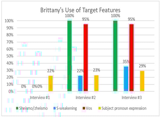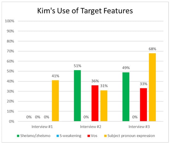 Overall, Kim’s use of the features under investigation moved toward target-like norms 2.5 months into the sojourn and away from those norms immediately following SA (after 5 months, see Table 3 and Figure 1). At the beginning of SA, Kim did not use sheísmo/zheísmo, /s/-weakening, or vos. She used overt pronouns 41% of the time, which, curiously, is the SPE percentage that studies have found in Dominican Spanish (41%, Otheguy et al., 2007), the dialect Kim reported she had been exposed to prior to arriving in Argentina. By the second interview, although Kim did not exhibit /s/-weakening, her use of sheísmo/zheísmo and vos increased significantly to 51% and 36%, respectively, moving toward BAS norms. Her use of overt pronouns also moved toward BAS norms, reaching 31% overt pronoun use, which is in the range of the target NS SPE rate of 21–32% found in BAS (Barrenechea & Alonso, 1977; Soares da Silva, 2006). In the final interview, she used sheísmo/zheísmo and vos slightly less than in interview 2 (49% and 33%, respectively), exhibited no /s/-weakening, and moved away from NS overt pronoun use across dialects of Spanish, with her highest SPE rate of 68%. Kim’s move away from BAS norms in interview 3 could have been affected by the final interview being conducted immediately after her return home, where she had returned to hearing English and had reunited with Dominican friends.