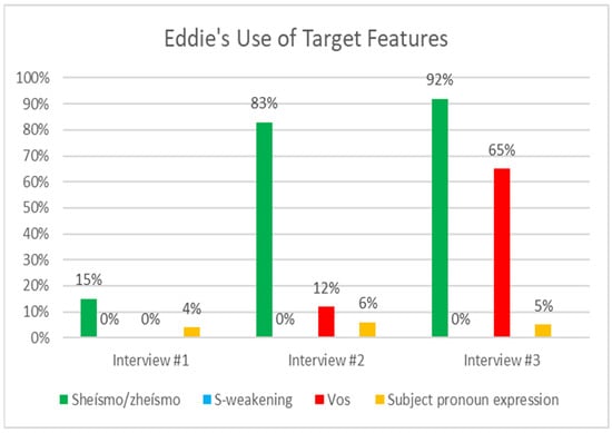 Overall, Eddie’s use of sociolinguistic features seemed to move toward target-like norms with respect to the characteristics traditionally associated with BAS, sheísmo/zheísmo and vos; however, this was not observed for the other characteristics under investigation, /s/-weakening and SPE (see Table 4 and Figure 2). Eddie’s first sociolinguistic interview was conducted upon his arrival in Buenos Aires, but he had already begun to exhibit the use of BAS phonemes 14.9% of the time in his pronunciation of “y” and “ll”, and he approximated NS norms significantly more as time went on (83.3% of the time 2.5 months in and 92.3% after 5 months). Similarly, although he did not begin to use vos immediately, he moved toward NS norms, exhibiting the use of vos 12% of the time after 2.5 months and 65% of the time at the end of 5 months abroad. In contrast, Eddie did not move toward target-like norms in his use of /s/-weakening and SPE; he did not exhibit /s/-weakening at all during SA, and he produced few overt subject pronouns throughout the sojourn (4%, 6%, and 5% of the time, respectively, in interviews 1, 2, and 3). This could be due to Eddie’s contact with Mexican Spanish prior to SA, which is known for /s/-maintenance and which tends to have lower SPE rates (19%) than other dialects of Spanish (see Otheguy et al., 2007). In addition, Eddie’s lack of /s/-weakening could have been related to the tendency of lower-proficiency learners not to perceive the feature.