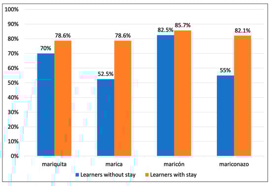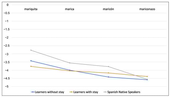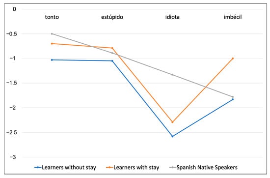 The difference in perception among Polish learners can be explained by the translation of tonto and estúpido into Polish as głupi, which does not distinguish shades of severity similar to those observed in Spanish. Additionally, the results show that learners with stays in Spanish-speaking countries tend to align more closely with L1 speakers’ values, although they do not fully replicate the exact progression.