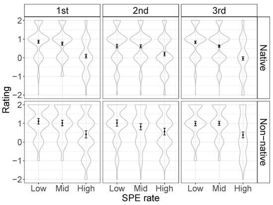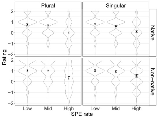 The model output, as can be seen in Table 7, reveals a significant main effect of SPE rate: Overall, native participants preferred stimuli with a low rate of SPE and tended to rate them as more appropriate ( 0.28, 0.01). No other main effects were found except for L2 experience, which showed a significant effect. This suggests that native participants with L2 learning experience tended to give higher ratings ( 0.24, 0.01). This is further demonstrated in Figure 4.