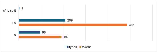 In terms of pragmatic value, 209 out of the 306 anglicism base types identified in the Instagram corpus show non-catachrestic features, and 96 types show catachrestic features.18 The lexical item live was found to occur in the form of both catachrestic and non-catachrestic tokens depending on the context of usage and was therefore categorised as a split item (for a more detailed discussion see ). Figure 1 depicts the predominance of non-catachrestic types in the Instagram content (nc 68.3%; c 31.4%), which is similar to the results for adult contemporary radio’s station imaging (nc 66.7%; c 31.4%). In terms of repetitive usage of catachrestic and non-catachrestic anglicisms, however, the radio station imaging corpus showed a higher rate of repetition for non-catachrestic types (nc: 10.54 tokens/type; c: 2.24 tokens/type) than the Instagram corpus (nc: 2.32 tokens/type; c: 1.98 tokens/type). From ethnographic observation and informal interviews with journalists at the youth radio station, it became evident that images and videos are frequently used by the station on social media as eye catchers for image-building purposes, whereas on radio, which is auditory only and where people tune in at different times, repetition is a key component of programming strategies and therefore generally more common than in other media. This is also in line with the findings of the researcher’s previous study on the use of anglicisms in adult contemporary radio station imaging, where non-catachrestic anglicisms were used repetitively by journalists on radio for attracting attention through their pragmatic markedness and for creating their station image ().