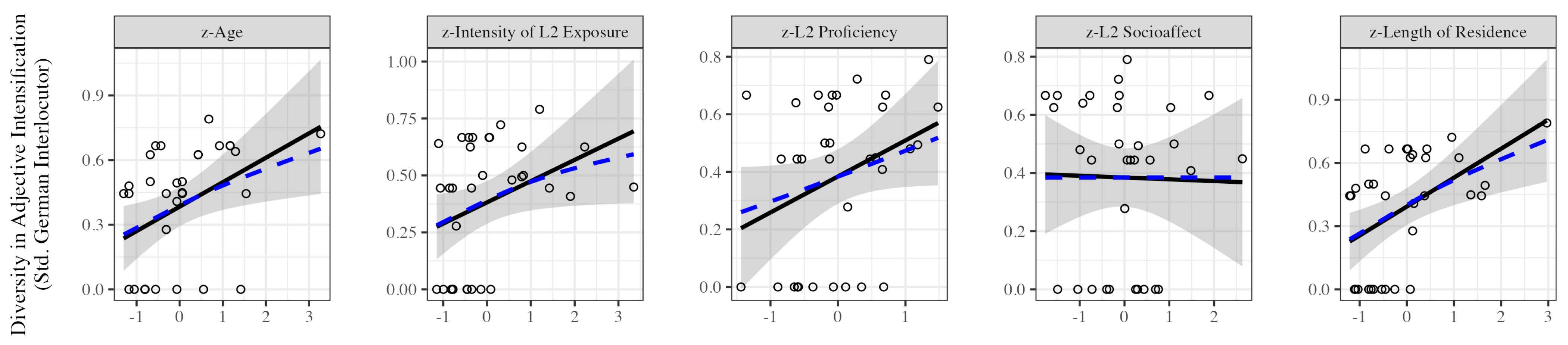 5.3. RQ3: Explaining Intra-Individual Variation in Adjective Intensification