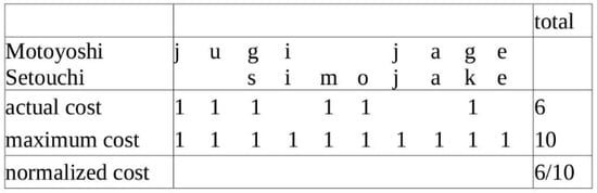 Given that the cumulative maximal cost is 10, the normalized Levenshtein distance is 6/10, i.e., 0.6. This means that the two realizations of shimoyake in the local dialects of Motoyoshi and Setouchi differ from each other by 60%.