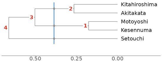 Inoue’s (2010) previous analysis, in the 20th century, of LAJ 82 words was based on the Kasai data (numerical data counted by a student named Hisako Kasai) or on standard word forms and mean values (or sums) by prefectures. By applying multivariate analyses to these data, the East Japan factor and the West Japan factor were obtained. Since middleclass Tokyo speech had been interpreted as being the basis of the Japanese Standard Language, the hidden power of the former cultural center, Kyoto, was both impressive and surprising. At the end of various analyses, Japanese dialects were classified into five divisions, namely Tohoku, Kanto–Chubu, Western Japan (Kinki-Chugoku Shikoku), Kyusyu and Okinawa, five areas which beautifully agree with the five divisions acquired by our current analysis, as shown in Figure 7 or Map 3 in Heeringa and Inoue (2023).