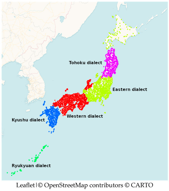 - Heeringa, W., & Inoue, F. (2023). Exploring the Japanese dialect geography dialectometrically: Division and continuity. Studies in Geolinguistics, 3, 1–44. [Google Scholar] [CrossRef]