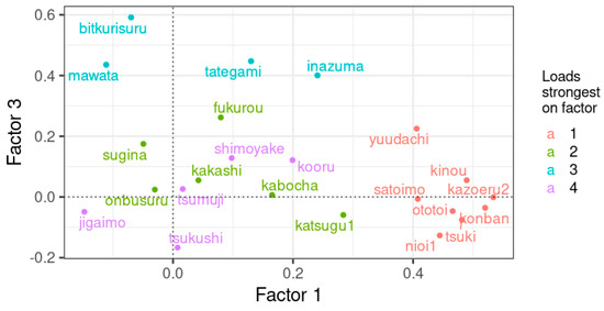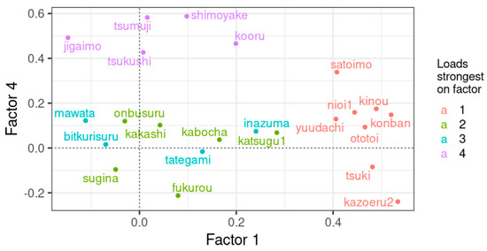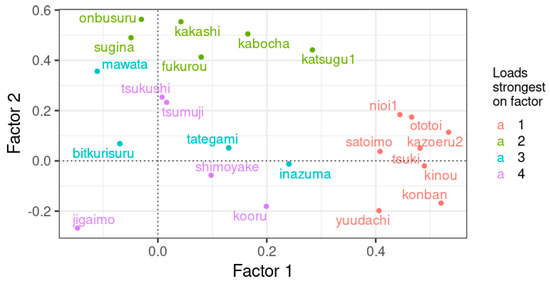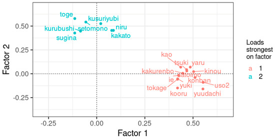 We classify the items so that each factor determines a group. Each item is assigned to the factor on which the loading is strongest. When determining this, we consider the absolute loadings. This is visualized in Figure 4, where the x-axis represents the loadings of the first factor, and the y-axis the loadings of the second factor. The items monomorai and oyayubi have the largest loadings on factor 1, while the items kooru and toomorokoshi have the largest absolute loadings on factor 2. The colors red and turquoise mark the respective groups.