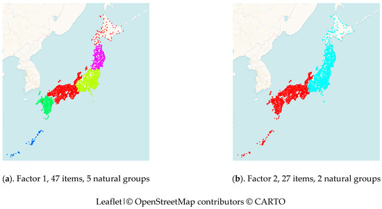 | 12 | Actually distances among all 2400 sites were calculated, and subsequently the distances to Tokyo were selected from the respective distance matrices. Considering the full datasets the Cronbach’s α values of the four groups are, respectively, 0.7738, 0.6518, 0.6738 and 0.3864. Since three coefficients are (slightly) lower than the threshold of 0.70 (see Section 2.2) the results should be interpreted with care. |
