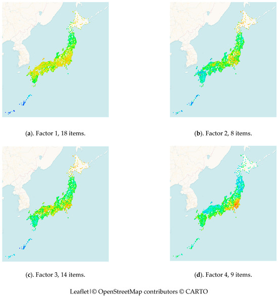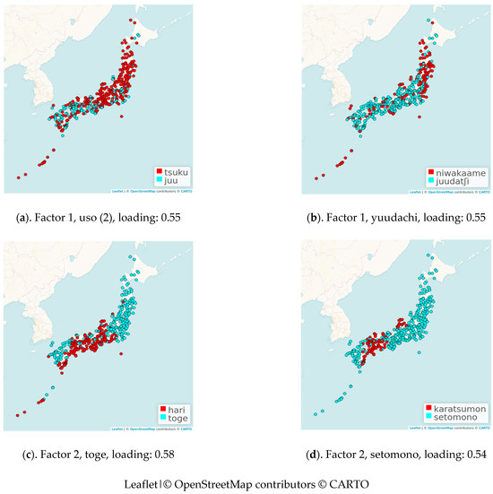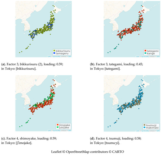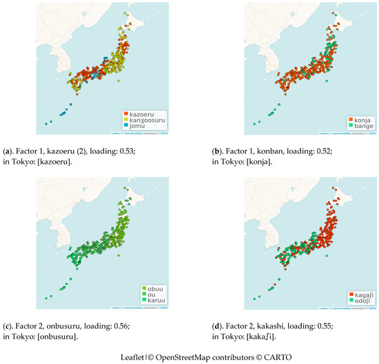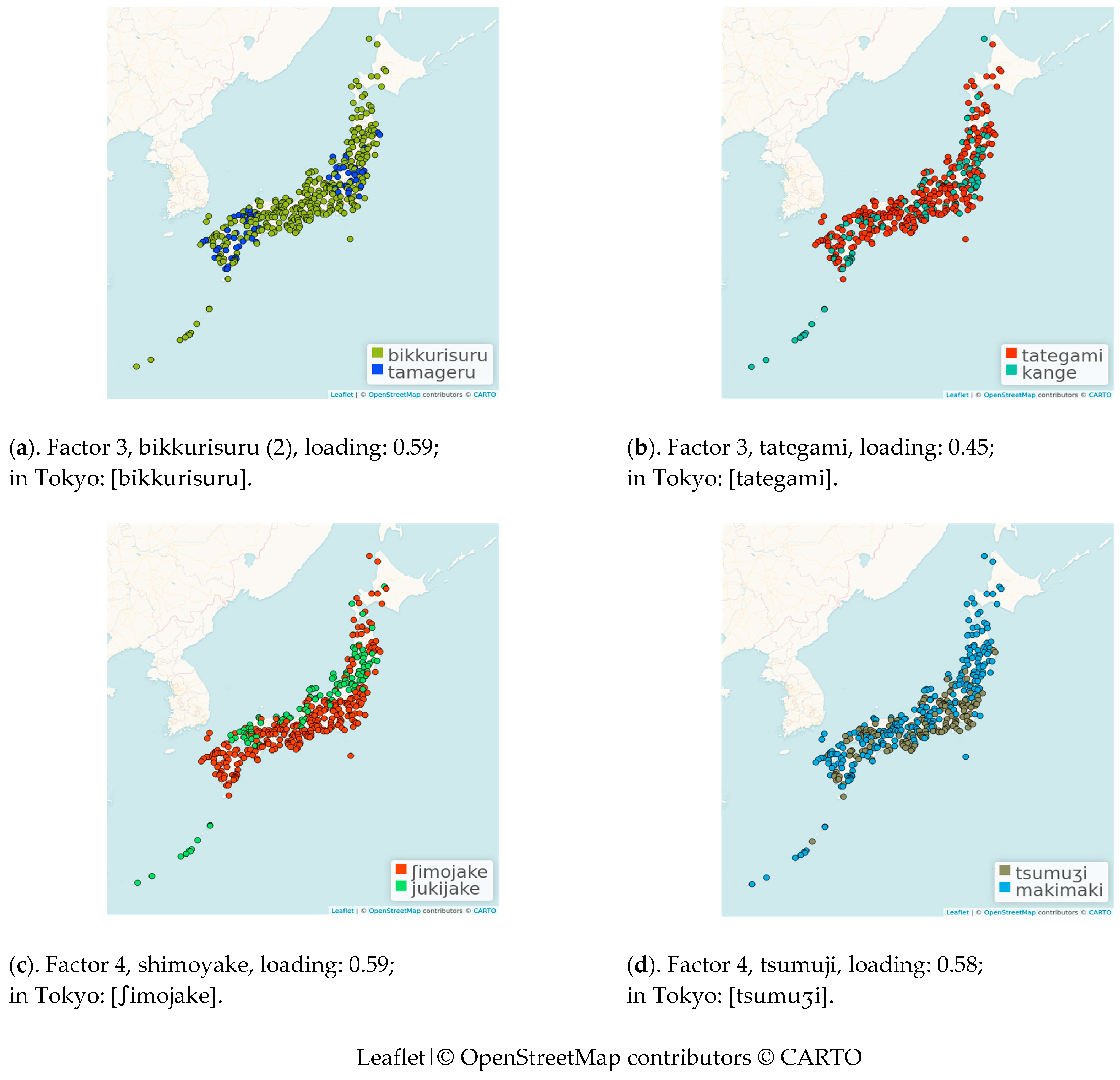 Heeringa and Inoue (2023) also presented a reference point map illustrating the distances between Tokyo’s local dialect and the other 2399 local dialects. The pattern shown in their map was confirmed by the map that we obtained using a larger dataset (see Figure 12). We performed a factor analysis in order to find the underlying patterns of this map as well. The distribution shown in the reference point map is mainly based on four patterns (see Figure 17). Although the patterns of the four maps vary, they consistently show that dialects closer to Tokyo are more similar to the Tokyo dialect. For each pattern, the items that support the respective patterns in particular are shown (see Figure 18 and Figure 19).