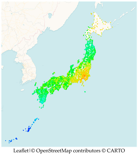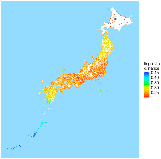 In Figure 12, the distances between the local dialects and Tokyo are visualized. The dialects in the vicinity of Tokyo are most related. Towards the southwest, the distances become greater, with the greatest distances on the islands in the southwest. As we go north, the distances initially become greater, but in Hokkaido, they then become smaller again.