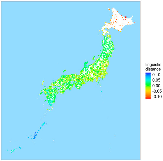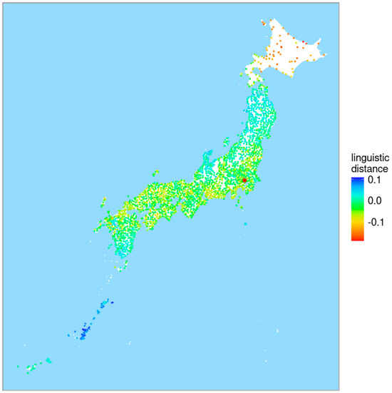 In Figure 23, the distances to Tokyo are visualized on the basis of the residues that were obtained by the gam model. On this map, dialects geographically closer to Tokyo appear less related to it, whereas the more distant Hokkaido dialects show a stronger connection. This unusual pattern in the Hokkaido dialect was previously observed by Inoue (2001) and Onishi (2019). One possible explanation is the development of a new dialect formation among settlers in newly established communities.