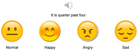 For the task assessing the recognition of emotional prosody, we first selected twelve statements with a semantically neutral content (such as “It is quarter past four”) and then asked a female Italian speaking adult to pronounce them with a neutral prosody and with happy, angry, and sad intonation. To verify whether the emotions were recognizable, we ran a first pilot study in which twenty adult participants had to associate each of the forty-eight sentences, presented in a randomized order, with an emoji depicting a neutral, happy, angry, and sad facial expression (see Figure 2). The overall accuracy was 94.6%. We then selected twelve items (that were correctly recognized by at least 18 participants out of 20), one for each statement and three for each emotion. We then ran a second pilot study, presenting only those twelve items, to another group of forty-one participants, who responded correctly 94.31% of the time. We thus used these twelve items as material for the Emotional Prosody Recognition task, which comprises twelve semantically neutral sentences pronounced with a sad, angry, happy, or neutral tone of voice., The task was implemented as a PowerPoint presentation, and the children’s task was to select the emoji that best matched the emotion conveyed by the speaker (see Figure 2).
