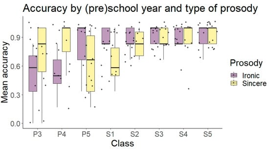 Box plots showing participants’ mean accuracy in the Ironic Prosody Recognition task across classes, from preschool (P3, P4, P5) to school (S1, S2, S3, S4, S5) children in the two prosody conditions.
