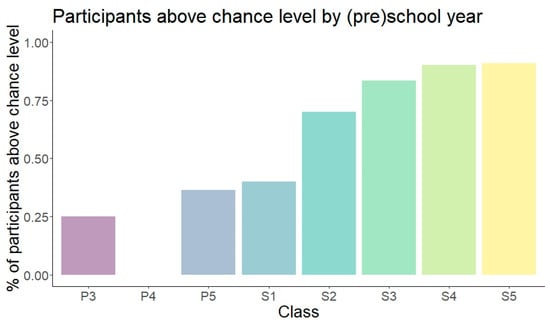Figure 4 further specifies the age trend. The majority of children aged 3 and 4 (groups P3 and P4) performed below the chance level, and about 50% of 5- and 6-year-old children (groups P5 and S1) performed above the chance level. The increase in participants above the chance level continued at ages 7 and 8, and almost all children between the ages of 9 and 10 performed above the chance level.