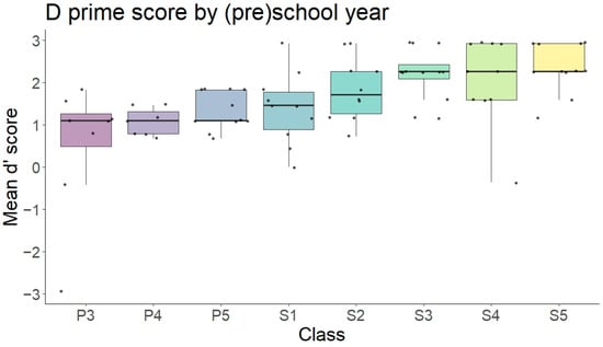 Moreover, we calculated the percentage of participants by class performing above the chance level. Considering that for each trial participants had a 50% probability of responding correctly and that the number of trials was 12, a performance was considered above chance if the score was greater than nine responses correct based on a binomial test (cumulative binomial probability = 0.02). Considering that participants might be biased towards one of the two possible responses, we also calculated d’ scores for each participant. D’ scores were analyzed with a linear model with age (mean centered) as predictor.