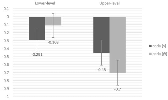 Participants rated L1 speech from Spain as significantly less educated with coda [Ø] than with coda [s] in the speech samples. This was regardless of learner level, as the interaction effect between variant and level was not significant, which could mean that both lower-level and upper-level learners are sensitive to the social meaning attached to /s/ deletion in Spanish and that minimal exposure is required for learners to develop attitudes towards this type of widespread variant.