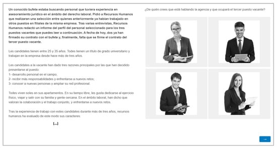 Participants had to complete an online survey in Qualtrics (www.qualtrics.com) consisting of several parts. First, they had to indicate their age, gender, and main language for communication. Then, based on the methodology in Lindqvist et al. (2019), participants were asked to read a single initial text, that is, the description of a job candidate, clearly written by a professional recruitment agency in a job recruitment context (a position in a law firm, as Carreiras et al. (1996) shows that, for Spanish speakers, law is considered a gender-neutral profession). Crucially, the text was written in one of the following four linguistic strategies of gender representation (i.e., a between-subjects design was adopted). The number of words for each condition was adjusted (between 2015 and 228 words16):