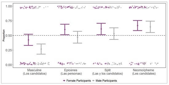 Proportion of selections of images of a woman in each condition. The purple color represents results by female participants, while the gray color represents results by male participants. Error bars represent the 95% of confident interval. Data points represent individual data at the participant level.