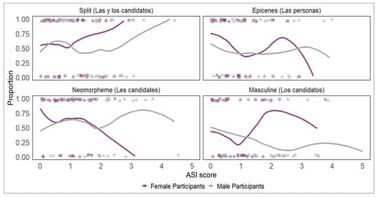 To explore the effect of the ASI on the data, we ran a second analysis adding the ASI as a third predictor (Variable 3). We included two factorial interactions: one interaction between the gender of the participants and the linguistic condition (Variable 1: Variable 2) and one interaction between these two factors and the centered ASI (Variable 1: Variable 2: Variable 3) without an intercept. This approach provided separate estimates for the choices of the picture representing a woman in comparison with the 50%, rather than a baseline comparison, for each combination of gender and condition for the average ASI score. It also provided a separate estimation of each combination in relation to participants’ score in the ASI. This means that the model offered, for example, the estimation of choices of a picture of a woman compared to the 50% by male participants in the split condition as well as the estimation of choices of a picture of a woman by male participants in this condition in relation to their score in the ASI.