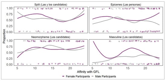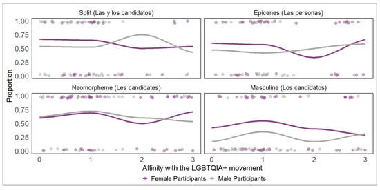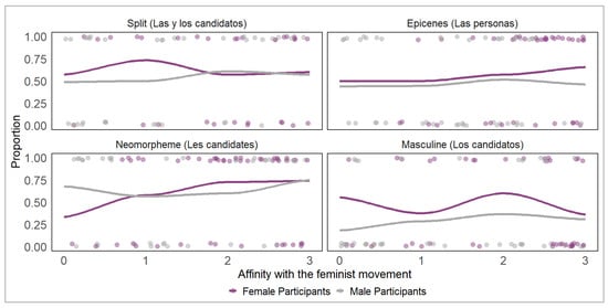 Another exploratory analysis was carried out in order to determine whether affinity to the feminist movement, to the LGBTQIA+ movement, and to GFL strategies modulated the picture selection. These three factors were included as fixed effects in separate analyses, together with the linguistic condition and the gender of the participants in a factorial interaction.
