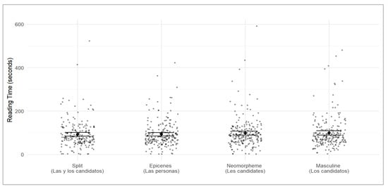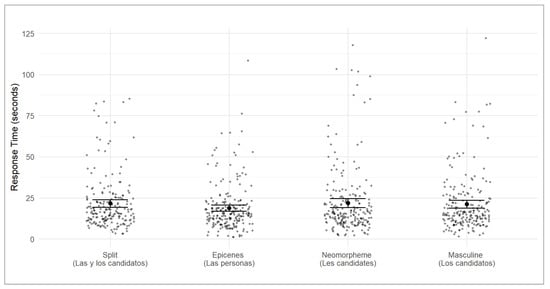 Finally, two additional analyses were conducted to examine whether the experimental condition influenced participants’ reading and response times. Separate linear models were fitted to assess the effect of condition on the time taken to read the scenarios and the time taken to select a response. In both models, the masculine condition was set as the reference level, allowing us to determine whether the other GFL conditions resulted in significantly longer reading or response times.