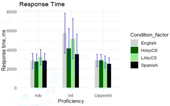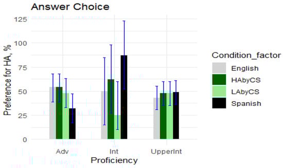 As can be gathered from Figure 2, advanced speakers do not demonstrate the target-like HA preference in Spanish. Meanwhile, intermediate speakers, the lowest proficiency group in the sample, demonstrate it (Condition_factor2:Proficiency_factor1; p = 0.01). The intermediate participants are also the most sensitive to the effect of CS (Condition_factor2:Proficiency_factor1; p = 0.01), the advanced sub-group is somewhat sensitive (Condition_factor2:Proficiency_factor2; p = 0.05), and the upper-intermediate one is not. The preference in English is more consistent across groups (Condition_factor1:Proficiency_factor2; p = 0.07).