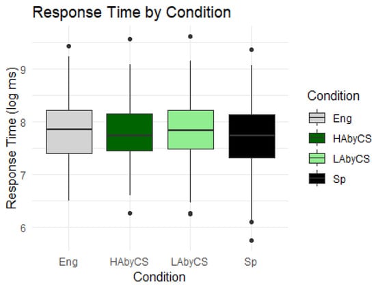 The raw response time data were log-transformed for the analysis. Same as in the previous analysis, we tested two lmer models, and like the previous analysis, the second model returned a lower AIC and BIC. Therefore, we report the results of Model 2 below.