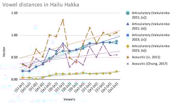 The figure presents vowel distance measurements in Hailu Hakka, comparing various methodologies (articulatory and acoustic) and data sources, including Vakulenko’s vector measurements from the earlier (Vakulenko, 2021) and the refined study (Vakulenko, 2023), as well as Li’s (2011) dataset and Chung’s (2017) dataset. To provide a more detailed examination of these measurements, separate figures are included in the Appendix A, illustrating the individual vowel distance comparisons for each methodological approach.