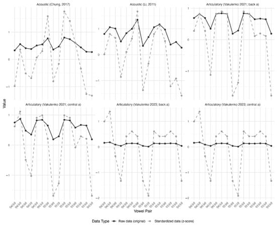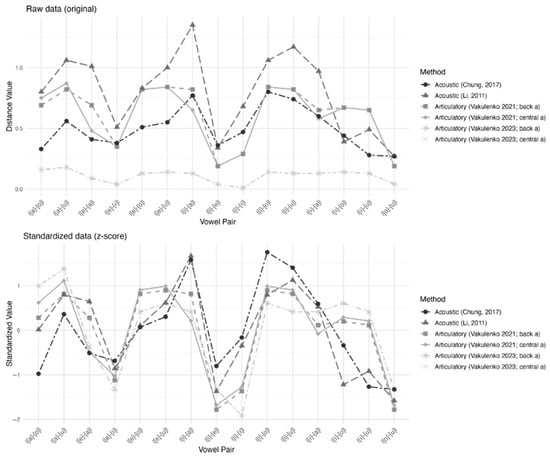 In Figure 2, the top panel displays normalized vowel distances based on articulatory models from Vakulenko (2021, 2023) and acoustic data from Li (2011) and Chung (2017). It presents the vowel-specific acoustic profiles across multiple speaker groups, illustrating raw formant values plotted across vowel categories. Clear variation is observed among the types, with certain vowels such as [a] showing systematically higher values and vowels like [i] and [u] showing lower values, consistent with their expected formant characteristics. The bottom panel depicts the same data following z-score normalization, which highlights relative deviations within each type. This transformation allows for clearer cross-type comparisons by removing baseline formant differences while preserving contrastive vowel patterns in a standardized scale.