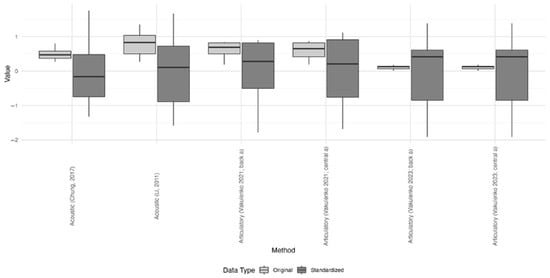 Figure 4 presents a comprehensive visualization of z-score-standardized vowel distances, derived from both acoustic and articulatory models, using boxplots. The models are based on data from Chung (2017), Li (2011), and Vakulenko (2021, 2023). The distribution spread and median lines illustrate the variability and central tendency of vowel distances across models. These boxplots depict interquartile ranges (boxes), overall variability (whiskers), and outliers (dots), although no z-scores exceeded ±3, indicating the absence of extreme values and suggesting distributional consistency across models. No z-scores exceeding ±3 were observed in any dataset, indicating the absence of apparent outliers and suggesting a consistent distribution across all models.