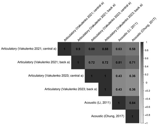 Figure 5 presents a Pearson correlation matrix showing the pairwise relationships between vowel distance measurements derived from two acoustic models (Chung, 2017; Li, 2011) and five articulatory models based on Vakulenko (2021, 2023).