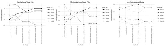 Within the high-variance group, the vowel pairs ([a]-[o], [i]-[a], [i]-[ɨ], [ɨ]-[o], [ɨ]-[u]) exhibit considerable fluctuations in distance values, reflecting inconsistencies in their spatial distribution. Closer inspection of the five vowel pairs across six models indicates that Vakulenko (2021) [ɑ] yields the most stable internal configuration. Li (2011) follows closely, maintaining relatively consistent distance values. Vakulenko (2023) [ɑ] and Vakulenko (2023) [a] display nearly identical patterns, while Chung (2017) stands out as the least consistent model in this group. In the medium-variance set ([a]-[u], [e]-[a], [e]-[o], [i]-[o], [i]-[u]), Vakulenko (2021) [a] emerges as the most stable, exhibiting the least fluctuation in vowel distances. Vakulenko (2021) [ɑ] and Li (2011) rank next in consistency, while Chung (2017) again shows the greatest degree of variation among models. Conversely, within the low-variance group ([e]-[ɨ], [e]-[u], [i]-[e], [ɨ]-[a], [o]-[u]), Chung (2017) presents the most stable vowel distributions, followed by Li (2011). In contrast, Vakulenko (2021) [a] and [ɑ] demonstrate increased variability, suggesting less internal consistency in their spatial vowel representation under this subset. In general, the model proposed by Li (2011) yields the most consistent values.