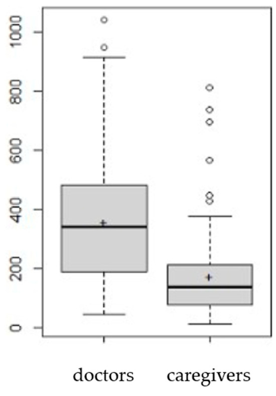 The 216 recorded interactions are balanced with respect to the number of conversations primarily involving doctors (n = 107) and caregivers (n = 109). However, the number of intonation phrases (i.e., transcript lines) per conversation differs significantly, with more produced in doctor–patient interactions than in those with caregivers (median: 341 vs. 139, mean: 359 vs. 175, t-test: t = 7.5, df = 185.8, p > 0.01), as illustrated in Figure 1. This does not necessarily imply that doctors spend more time with patients, as caregivers devote a considerable portion of their time to non-verbal care activities (e.g., washing, wound care, administering medication, etc.).