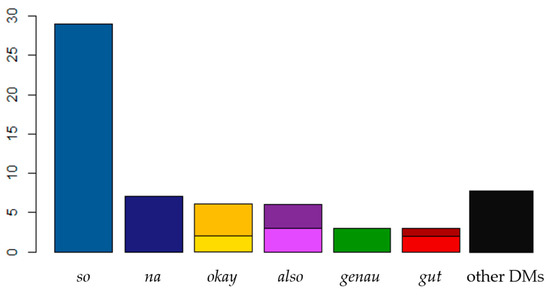 In the majority of the 216 interactions in the corpus, the opening takes place without any DMs. However, if the opening sequence includes a DM, the German so (for a comparison with English so see Barske & Golato, 2010, pp. 247–248) is by far most frequently used in this position of conversation (n = 28). This is in line with the previous literature on German so marking “the beginning of the actual activity” (Schwitalla, 2002, p. 246, author’s translation) due to its “focusing quality” (Meier, 2002, p. 74, author’s translation) and is already documented for opening sequences in classroom interactions (cf. Mazeland, 1984), business meetings, and in the courtroom (cf. Meier, 2002; see also Barske & Golato, 2010, p. 246).