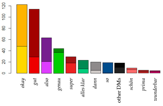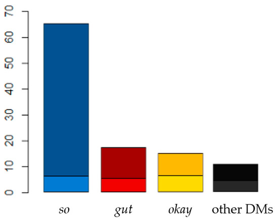 The darker parts of the bars (above) in Figure 2 indicate clear cases of discourse-structuring, whereas the lighter parts of the bars (below) include ambiguous instances that overlap with other functions (see Section 2) such as positive evaluation for gut (cf. Arens, 2023; see Excerpts 1 & 2) or display of understanding for okay (cf. Betz & Deppermann, 2021). This color scheme applies to all upcoming figures as well.