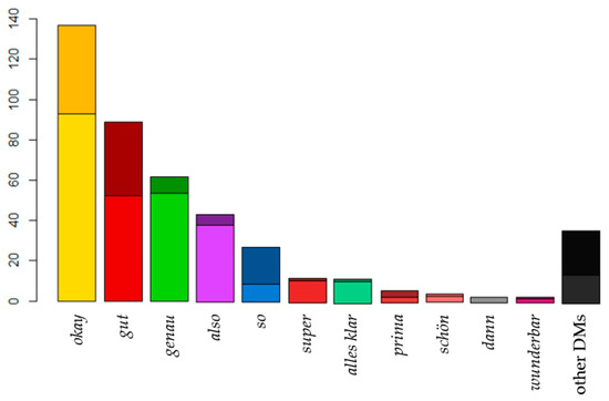 However, DMs are multifunctional and thus also partially functionally ambiguous by nature. Therefore, differentiation was conducted based on whether the DMs solely fulfill a discourse-structuring function or overlap with other functions—such as reformulation (for also, cf. Deppermann & Helmer, 2013), positive evaluations (for gut, schön, super, wunderbar, etc., cf. Arens, 2023), display of understanding (for okay and gut, cf. Betz & Deppermann, 2021), agreement marking (for genau, gut, and okay, cf. Oloff, 2017, 2019), or question tags (okay with rising intonation, cf. König, 2017).