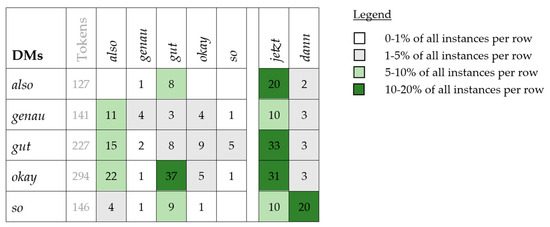 A descriptive heatmap table shall give insights into the possible and recurrent patterns of co-occurrence (cf. Betz & Sorjonen, 2021, p. 28) among structural DMs in conversational transitions (Section 3.2).