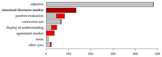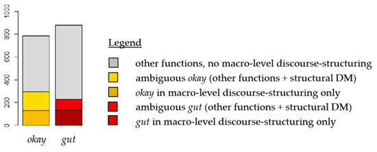 Last, but not least, this study wants to illustrate another analytical pathway of investigating DMs not as single forms but holistically as a functional category. This is achieved by quantifying the proportion of the macro-level structuring function within the multifunctional spectra of the two most frequent DMs in the Palliative Care corpus, namely, okay and gut. Even if it holds true that “[t]ransitional okay and gut […] do not show differences in use (closing and projecting)” (Betz & Sorjonen, 2021, p. 27, see also Meier, 2002, p. 111), it is highly interesting to compare the quantitative distribution of the different functions.