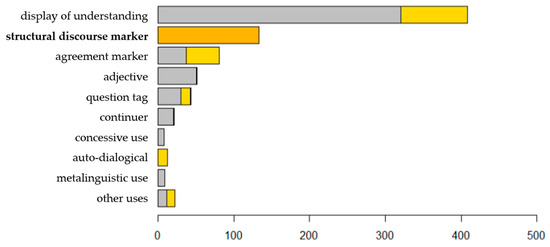Discourse structuring at a micro-level, for instance, within turns, as turn-transition devices (cf. Degand & van Bergen, 2018) or re-formulations (cf. Del Saz Rubio, 2007), is not included in this analysis, since these functions are often more specific and linked to certain DMs, for instance also as a reformulation marker (cf. Deppermann & Helmer, 2013) or turn-initial ja (cf. Nilsson, 2013).