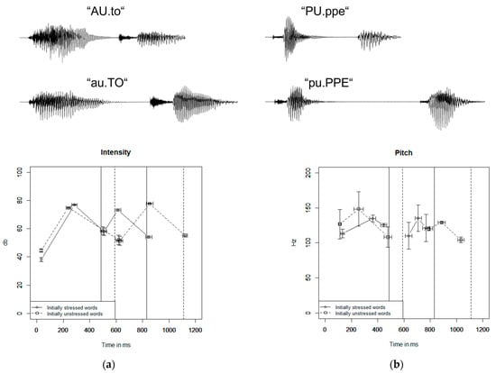 Cutler & Jesse, 2021). Here, we used materials produced by a professional human speaker, who we have asked to stress the target word either correctly or produce a version that is stressed on the second syllable rather than on the first. We considered naturally spoken material to be more suitable for testing natural speech processing in very young children than computerized speech. In this way, however, we were unable to control or ensure the variation in all acoustic parameters. Thus, the speaker realized our intended stress manipulation not via different pitch but via different intensity values of the initial syllables of the correctly stressed words and their incorrectly stressed versions. In addition, timing of maximal pitch and maximal intensity differed (see